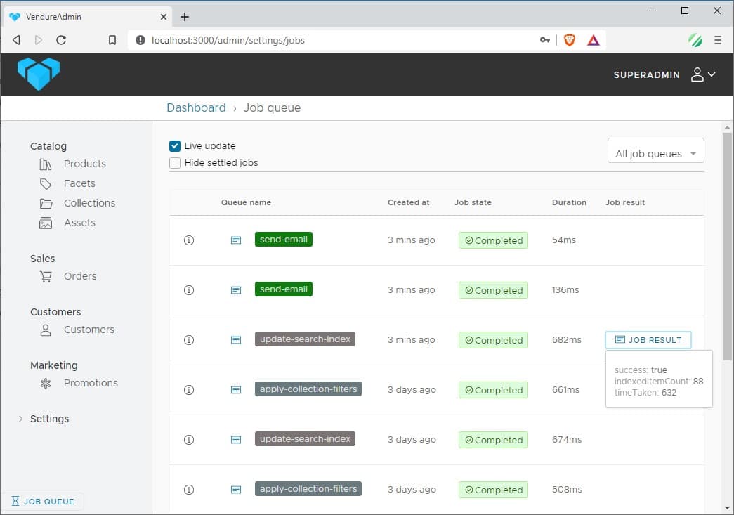 Vendure v0.11.0 introduces a powerful new job queue which allows multiple queues to be defined, each with their own concurrency controls and the ability to retry tasks in the case of failure.