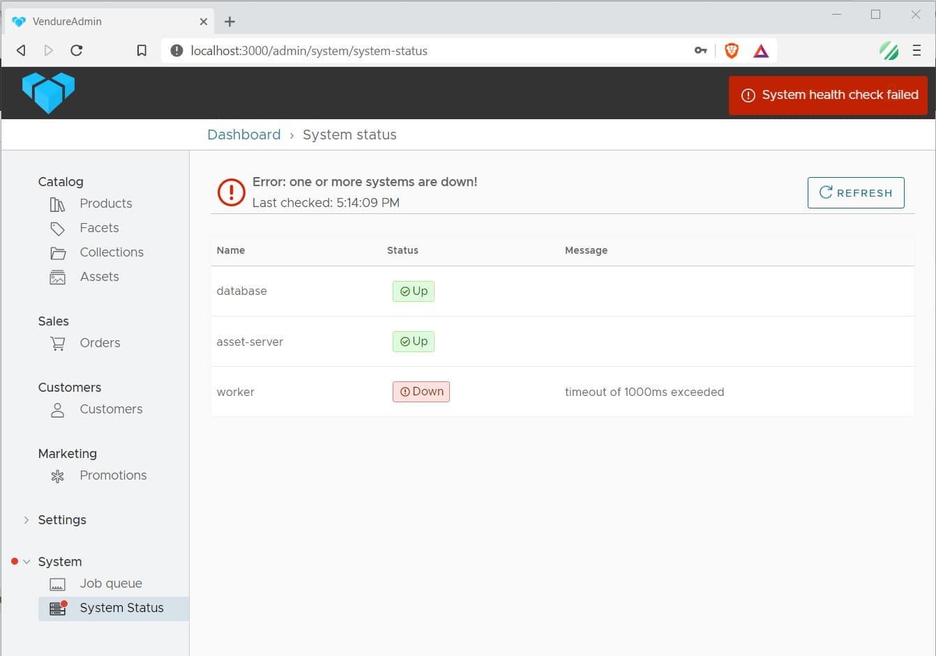 Version 0.12.0 adds a new health check endpoint which returns a report of the health of each of the parts of your Vendure instance. Plugins which depend on external services can also register their own health checks by injecting the new HealthCheckRegistryService.