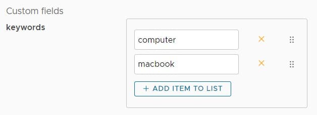 Custom fields enable the built-in entities (Order, Customer, Product etc) to be extended with new data fields specific to your business needs. With this release, custom fields can now be lists (arrays) of the specified type. For example, you may wish to define "keywords" on your Product entity for use in SEO. This can be done with a list of strings: