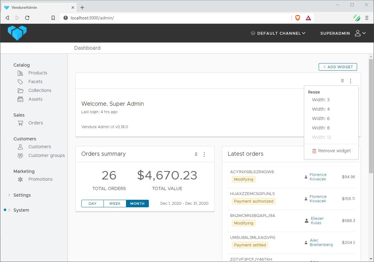 The Admin UI dashboard now supports "widgets" - self-contained components exposing useful information such as recent orders, sales totals, charts, etc.