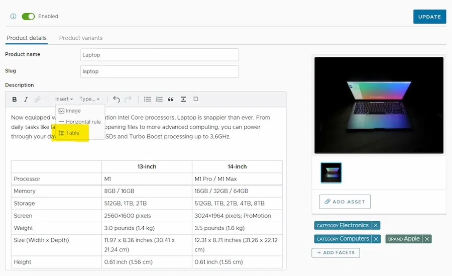 The rich text editor used for product & collection descriptions now supports HTML tables as well as iframe embeds.