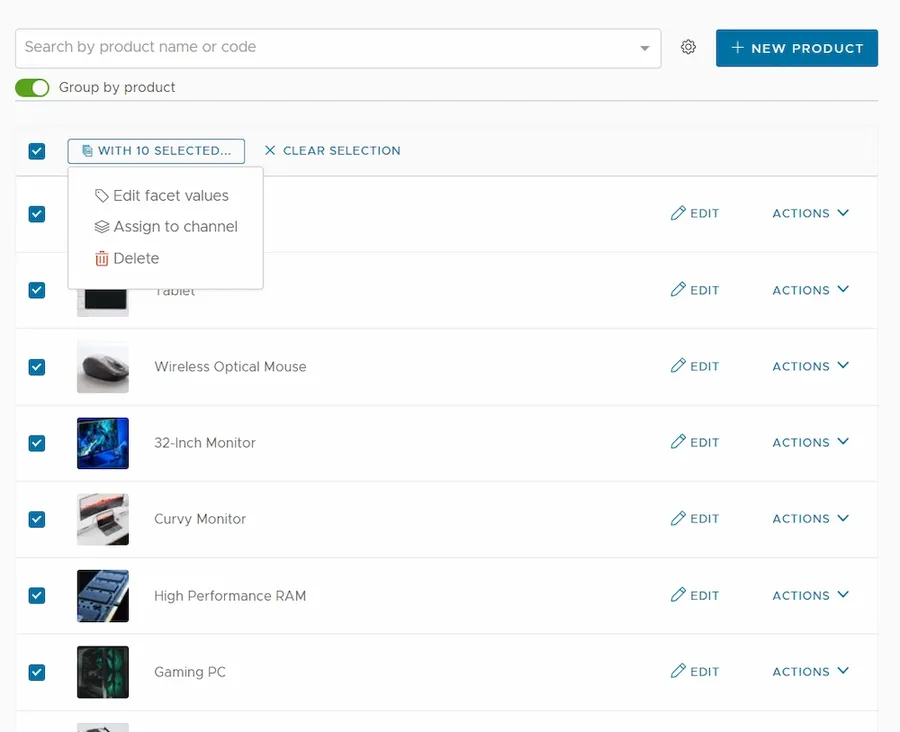 You'll now notice that the products, facets & collections list views in the Admin UI feature checkboxes to allow you to select multiple items. Once selected, a new bulk action menu will become visible at the top of the list. This list contains context-aware actions that can be performed on the selected items, such as bulk deletion or assigning to other channels.