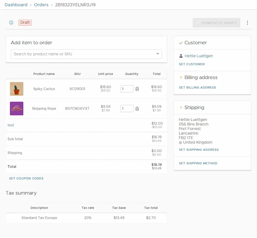From there you'll be taken to a screen from which you can populate the order with products and set the customer, shipping and billing details. Once complete, the order can transition to the ArrangingPayment state from which a payment may be added.