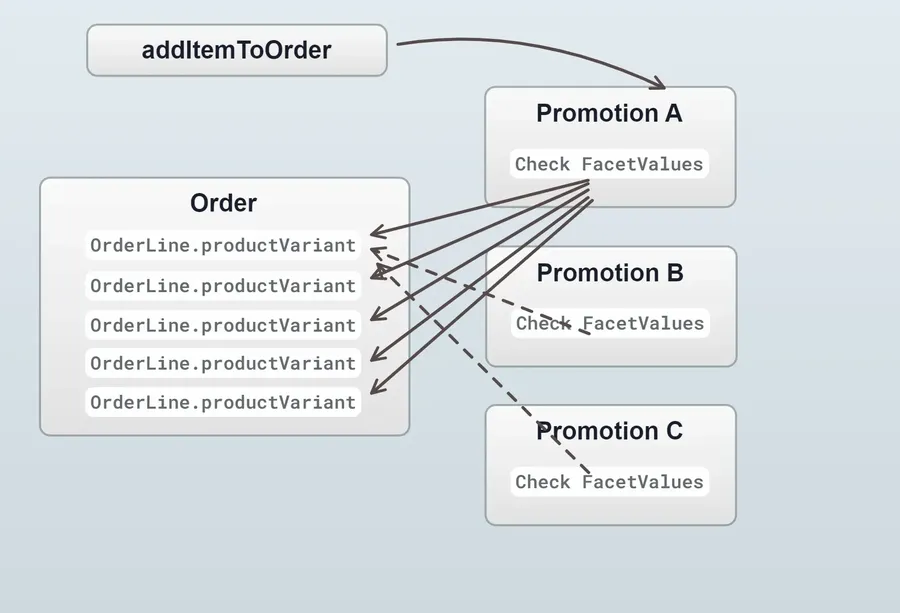 First, let us consider a real-world example that motivated the development of this feature. A common way to set up promotions in Vendure is to base them on facet values: "if the order contains any products with the 'summer sale' facet value, discount that order line by 10%". Behind the scenes, whenever you add something to the order, each line needs to be checked against this promotion. When you consider that there might be 50 or 100 such promotions, and 100 order lines, you can probably imagine that the amount of time spent checking the facet values becomes significant. In fact, we found that this exact scenario was leading to unacceptable performance in some cases.