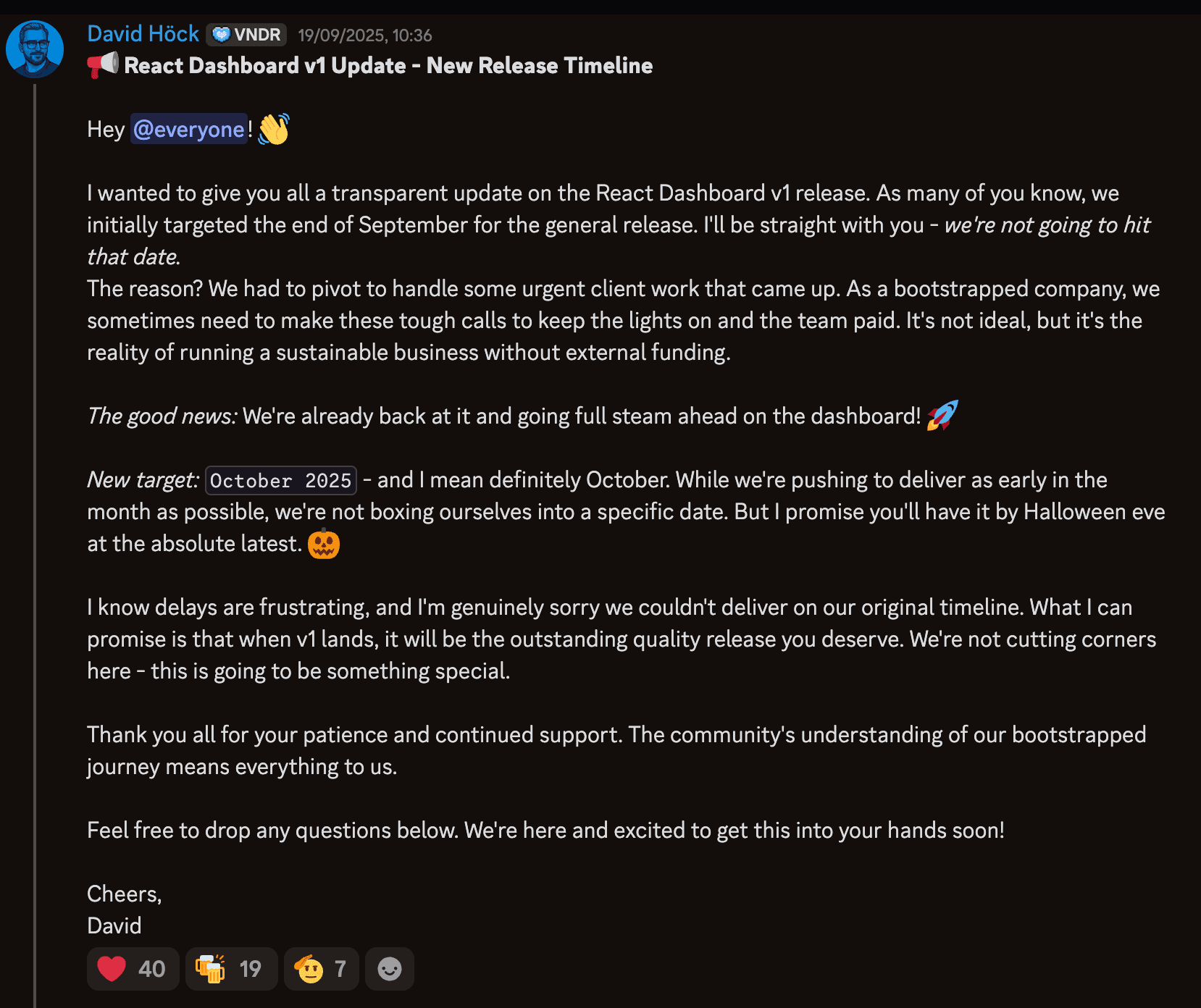 We missed our September deadline for the React Dashboard v1 release. There's no sugarcoating it. When urgent client work demanded our attention, we had to make a choice that every bootstrapped company faces: prioritize immediate business needs to keep the team running.