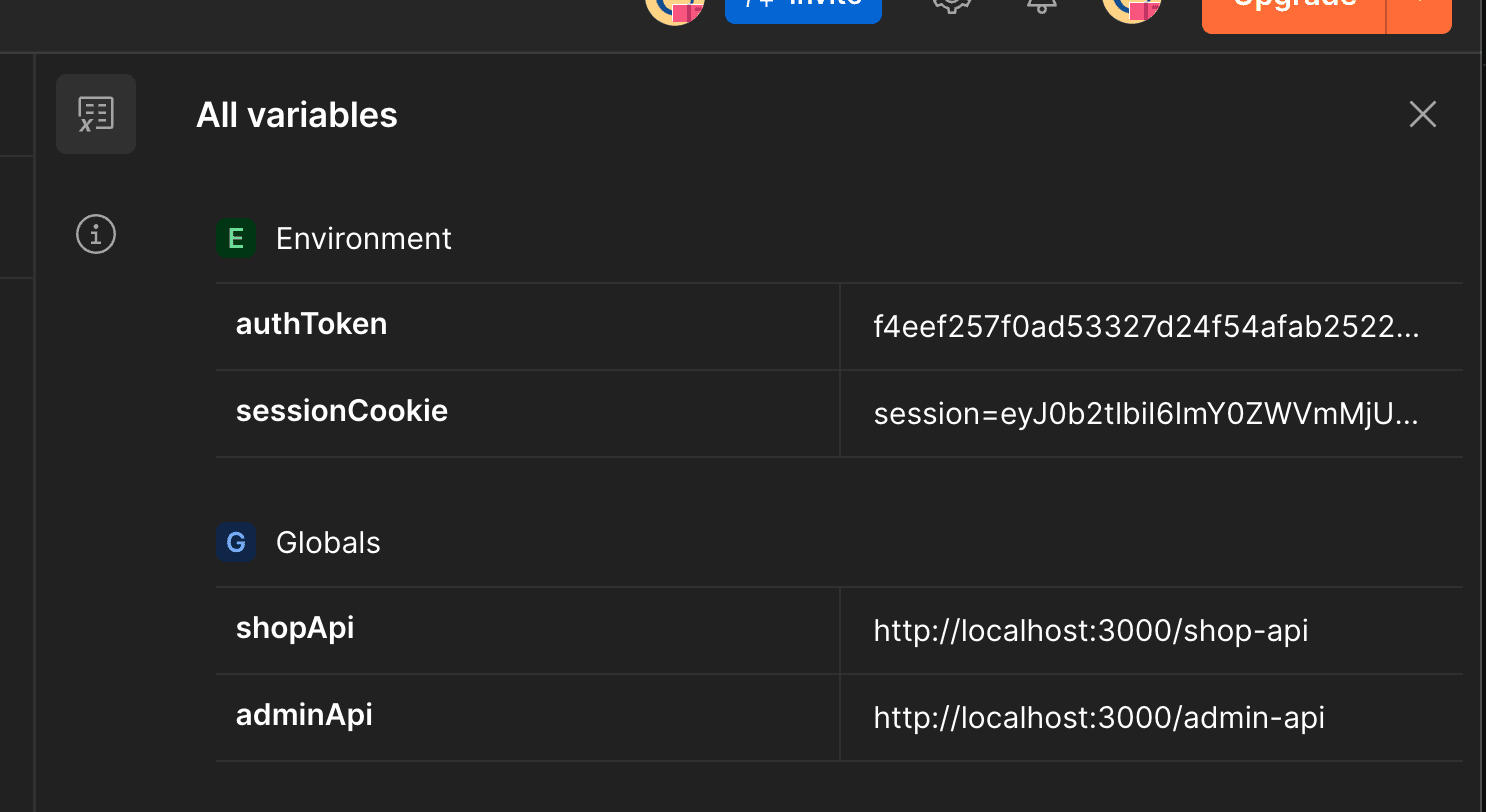 - In your Postman workspace, navigate to the Environments tab and select your forked "Vendure-Local" environment.