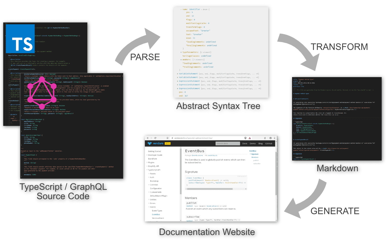 Vendure attempts to mitigate this problem by generating the bulk of the documentation of its TypeScript and GraphQL APIs directly from the source code. Both TypeScript and GraphQL have the advantage of being statically-typed languages. Furthermore, both the typescript and graphql npm packages come with code-parsing functions which allow you to turn your source files into abstract syntax trees (ASTs) (if you are not familiar with the idea of ASTs, check out these interactive examples of the GraphQL AST and TypeScript AST). Once parsed into an AST, the rich type information as well as JSDoc-style comments can be used to generate the documentation.