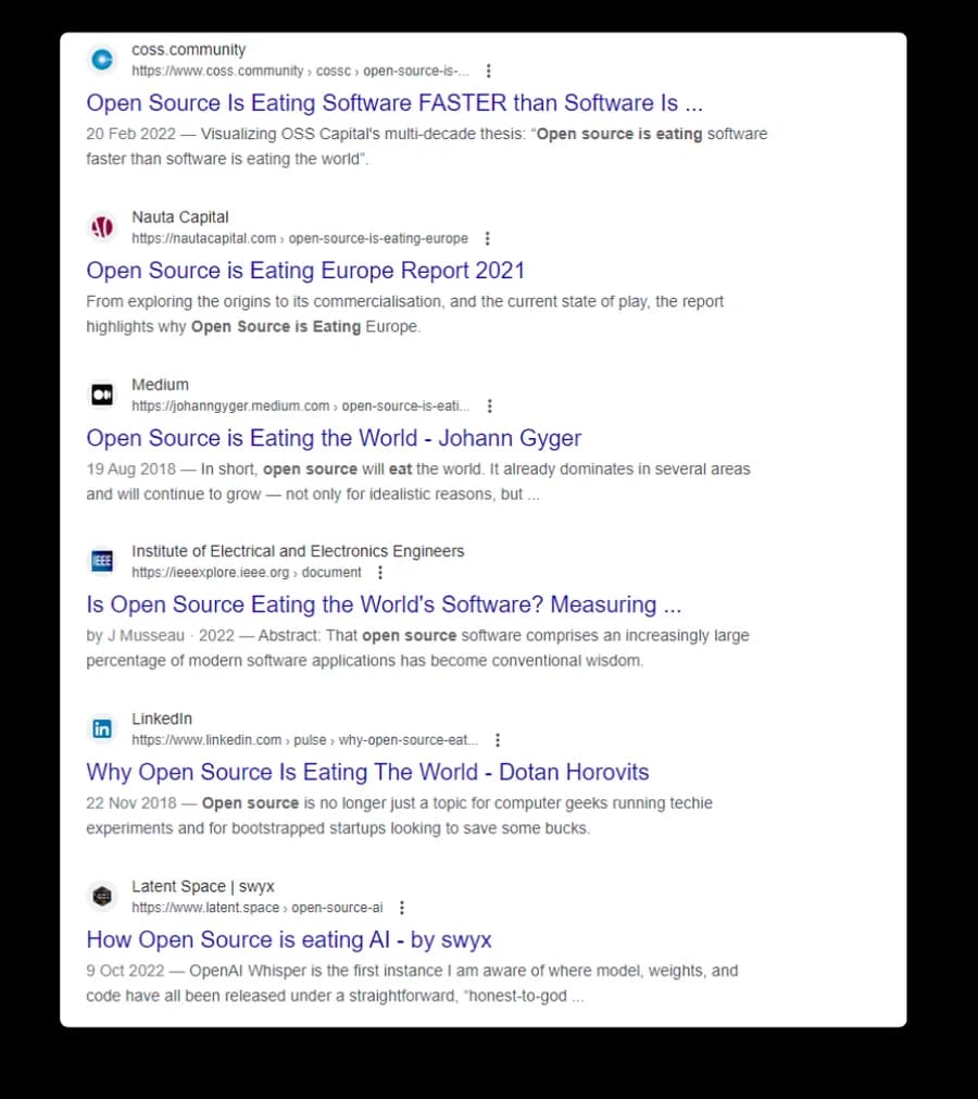 Within the ongoing eating of the world, a similar process has been taking place, fractal-like, within software itself as closed, proprietary solutions have been increasingly replaced by open source software (OSS) alternatives.
